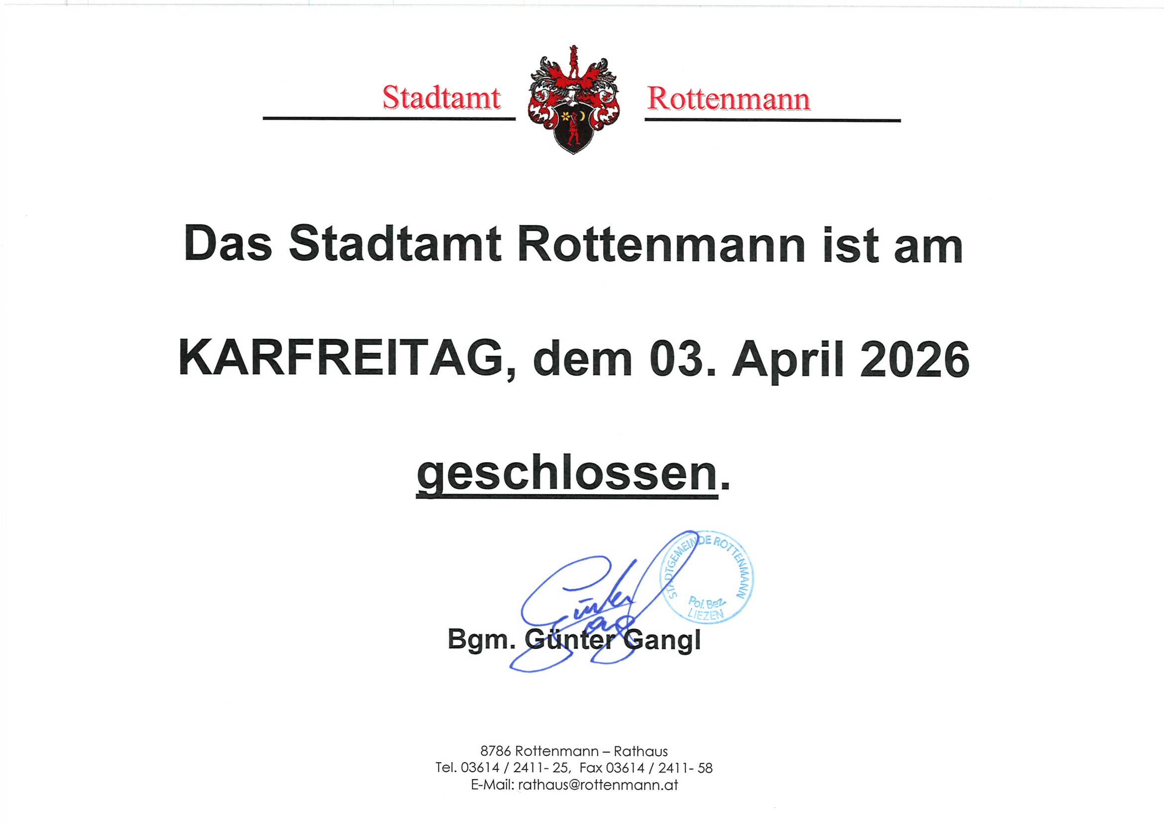 Die von der Stadtgemeinde Rottenmann im elektronischen Wege amtlich gefertigten Dokumente weisen die Amtssignatur der Stadtgemeinde Rottenmann auf.