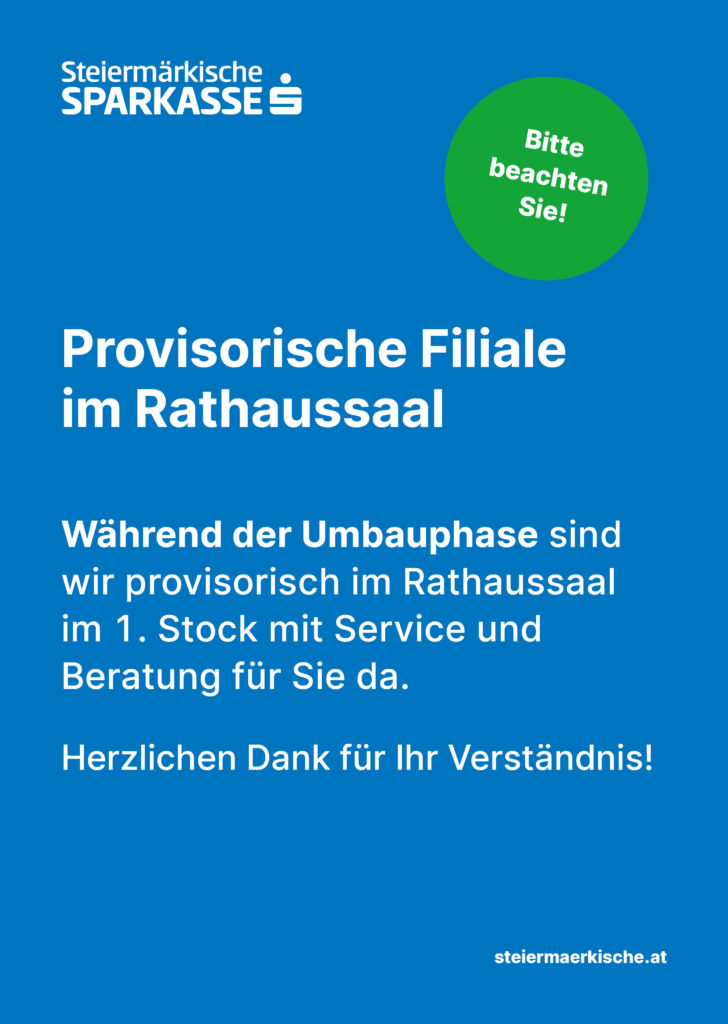 Provisorische Filiale der Stmk. Sparkasse ab 1.4.2026 im Rathaussaal im 1. Stock